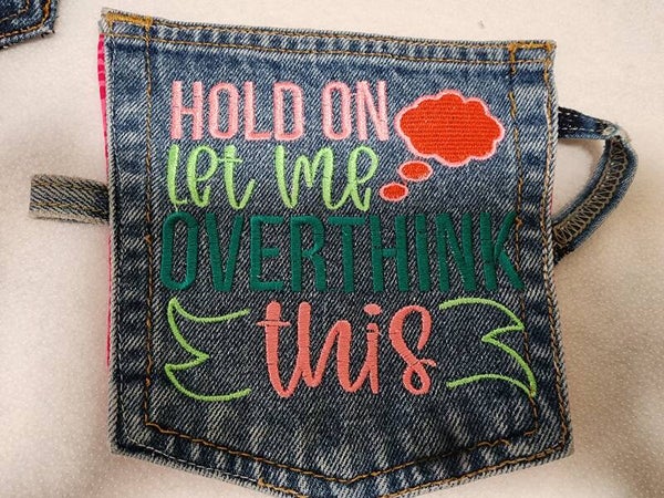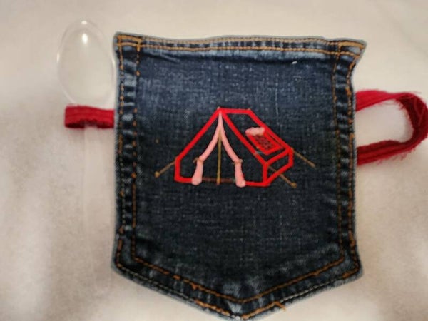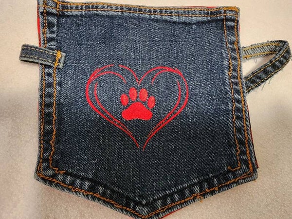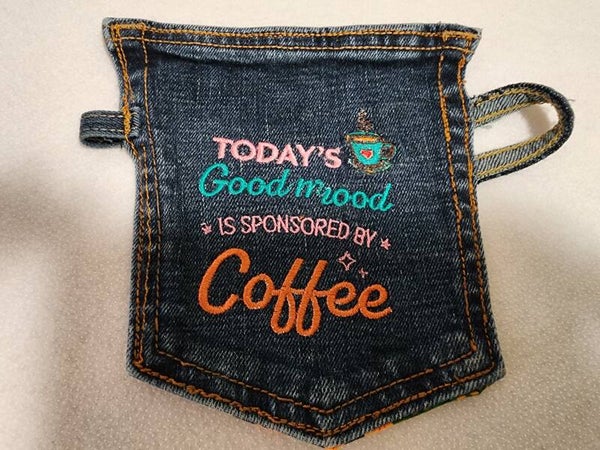Recycled and embroidered pocket coasters. With a loop on the left for a spoon and a handle that can be used to hang as a decoration in your kitchen.